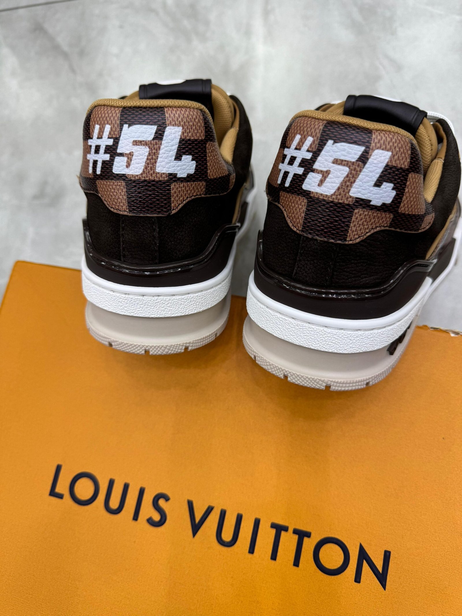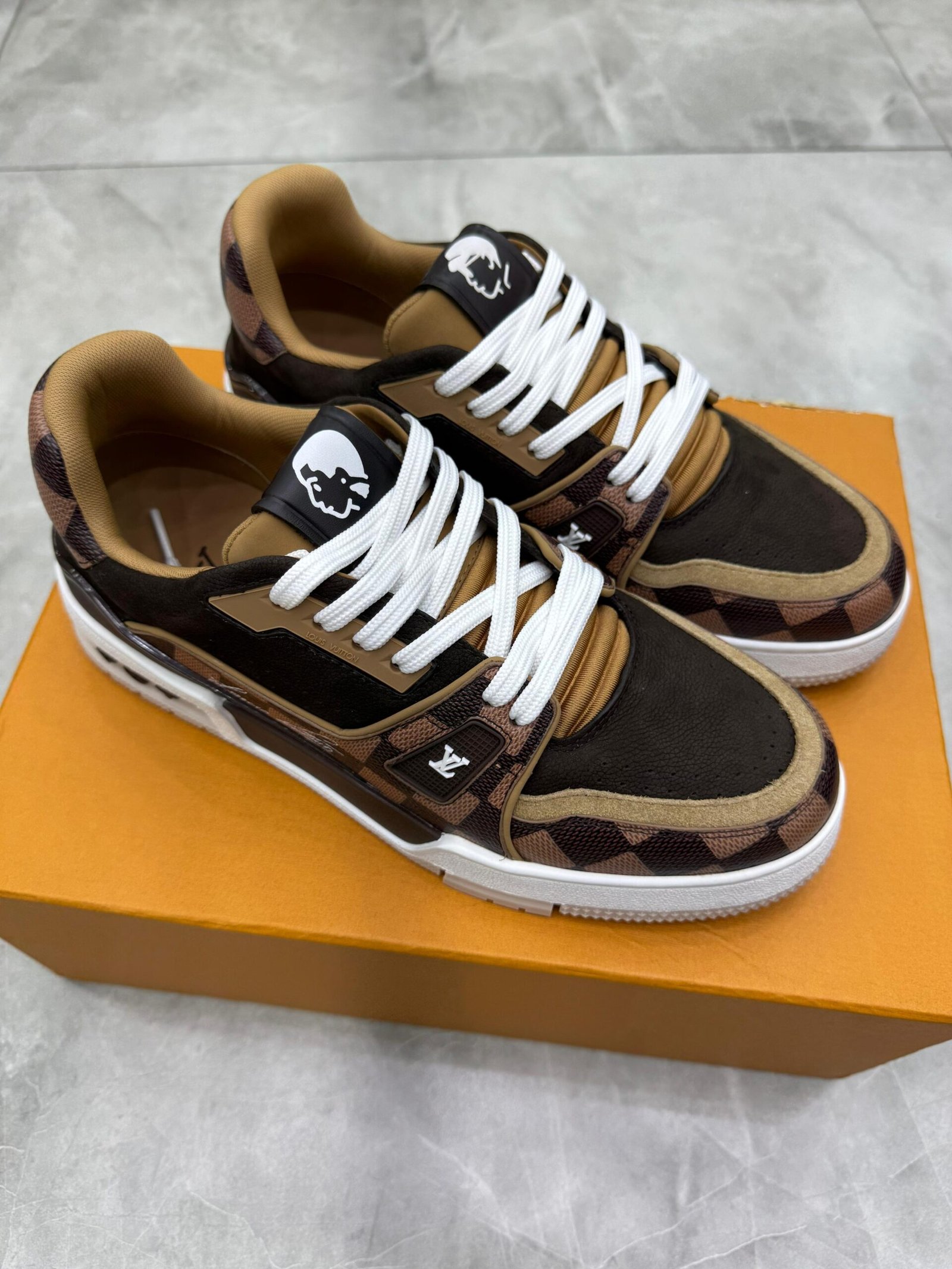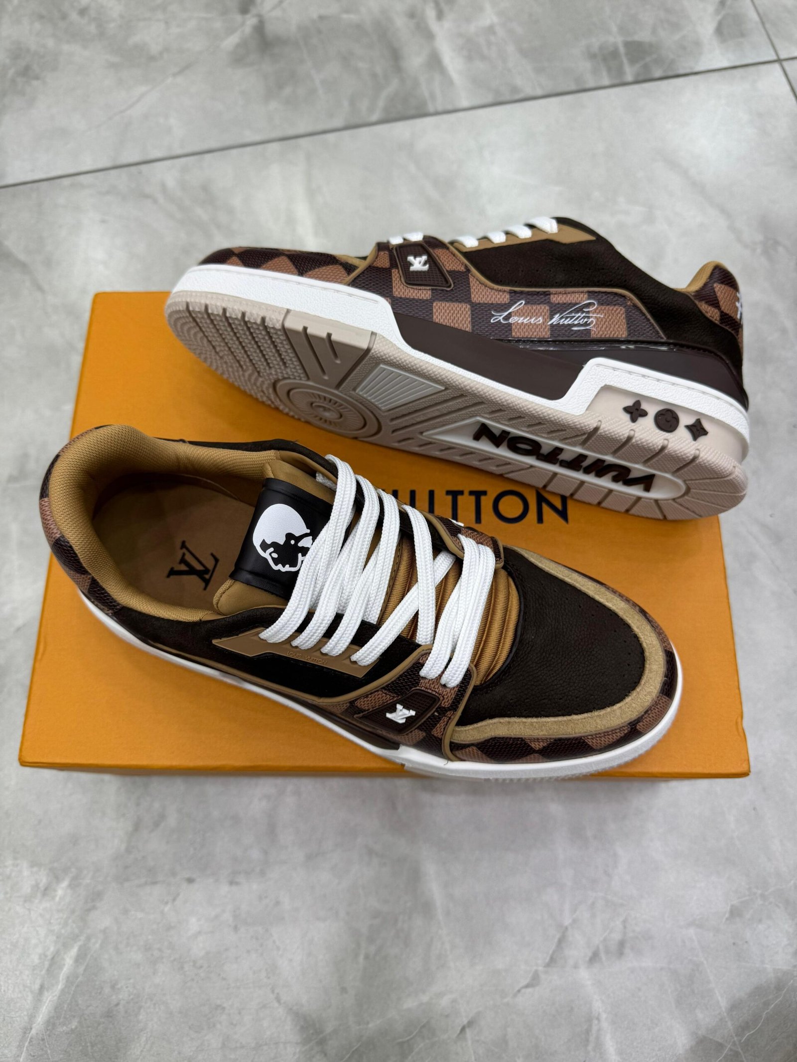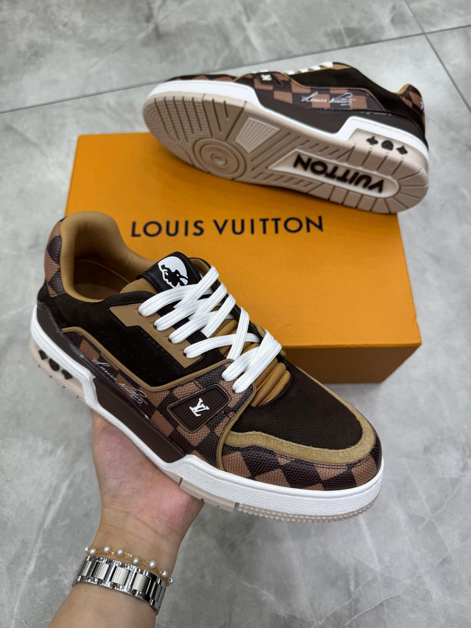 Esta edição sofisticada do tênis LV Trainer traz uma combinação de couro de vitelo granulado e couro de vitelo granulado Damier, que replica o icônico padrão da Maison. Originalmente criado por Virgil Abloh, esse modelo cult é inspirado nos tênis de basquete vintage. O solado tecnológico bicolor, decorado com Flores do Monogram, finaliza o design.